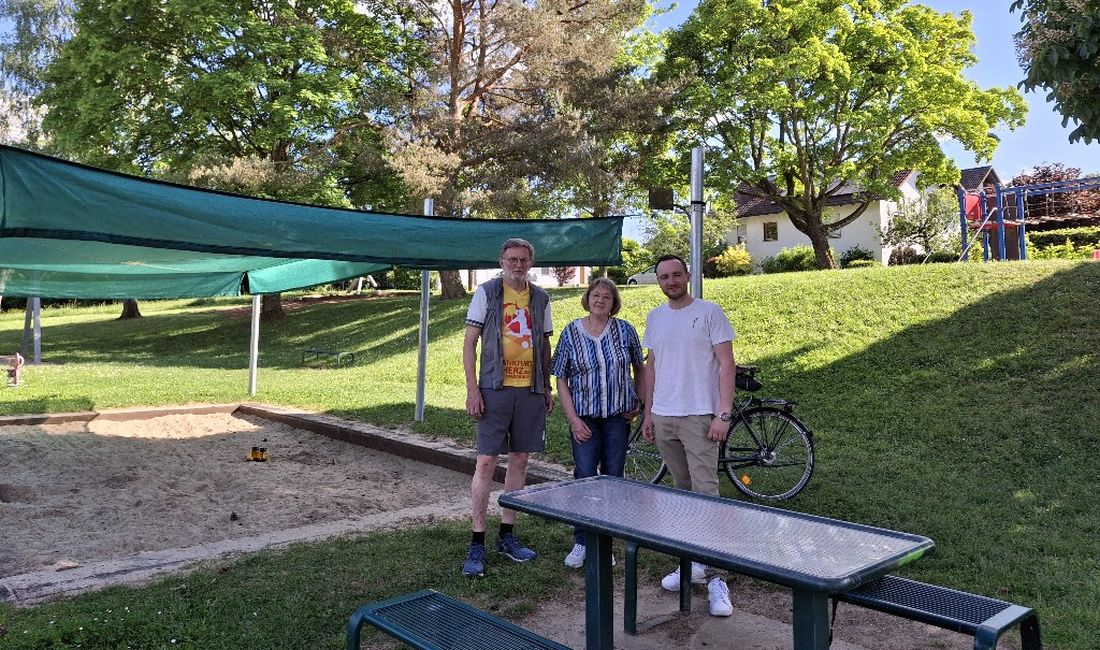 Von links: Werner Fischer, Ulla Liehm, David Mühle auf dem Kinderspielplatz am Eselspfad in Altenhaßlau.