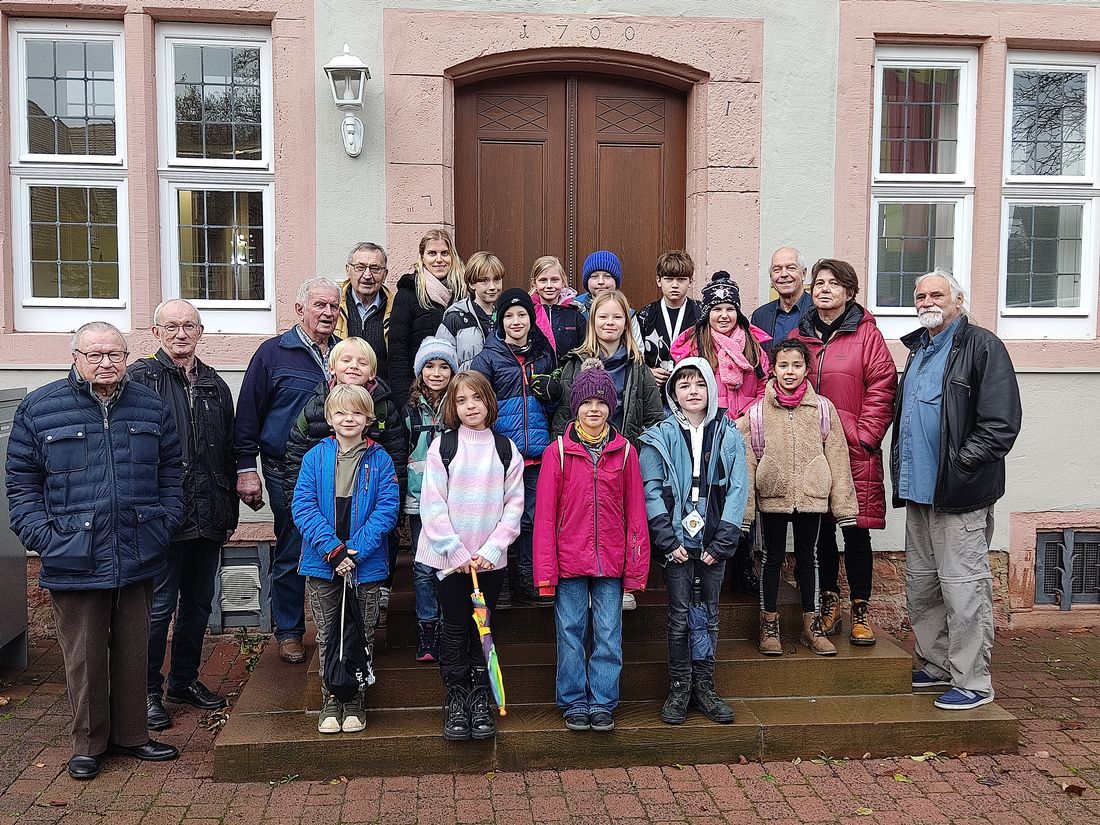 Die Klasse 3a der Haselaschule Altenhaßlau mit Klassenlehrerin Patricia Beck-Mankel und der Betreuerin Frau Schmidt-Steitz auf der Rathaustreppe in Linsengericht mit Bürgermeister Albert Ungermann, dem Vorsitzenden des Heimat- und Geschichtsvereins Linsengericht, Heinz Breitenbach, und der Museumsführerin Gudrun Weith und den Museumsführern Heinrich Brand, Wilhelm Lotz und Werner Schürer.