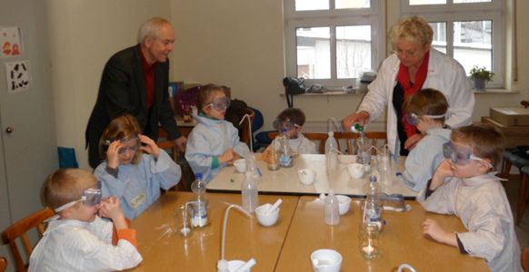 Foto: Bürgermeister Albert Ungermann staunte während seiner Stippvisite im „Chemielabor für die Vorschulkinder“ in der Kita „Brunnenkinder“ in Geislitz nicht schlecht über die Experimente, die die Kleinen unter Anleitung der früheren Chemielehrerin Erika Becker mit spannenden Ergebnissen durchführten.