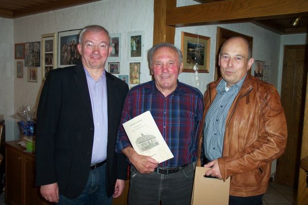 Aus diesem Anlass gratulierten der 1. Vorsitzende der Bürgerliste/FWG Linsengericht, Heinz Breitenbach und sein Stellvertreter, Klaus Balzer, dem Jubilar recht herzlich. Als Geschenk überreichten die beiden Herren, die aktuelle Ausgabe 2012 der Linsengerichter Geschichtsblätter und ein Weinpräsent aus der Partnergemeinde Alsónána.