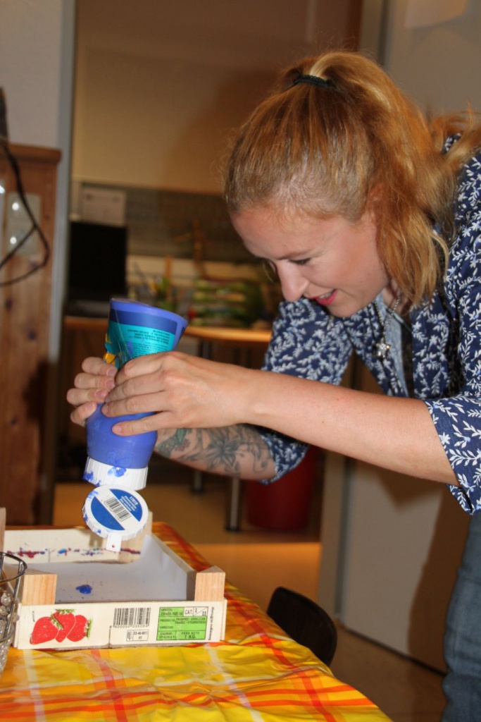 Foto: Tagesmutter Stephany Günther fertigt ein Farbbild. Dazu lässt sie verschiedene Farbkleckse auf ein in einem Schuhkarton platziertem Blatt Papier durch darüber gleitende Murmeln zu einem farbenfrohem Bild werden. Kinder können bei diesem Experiment beispielsweise lernen, wie Farben sich verändern, wenn sie sich vermischen.
