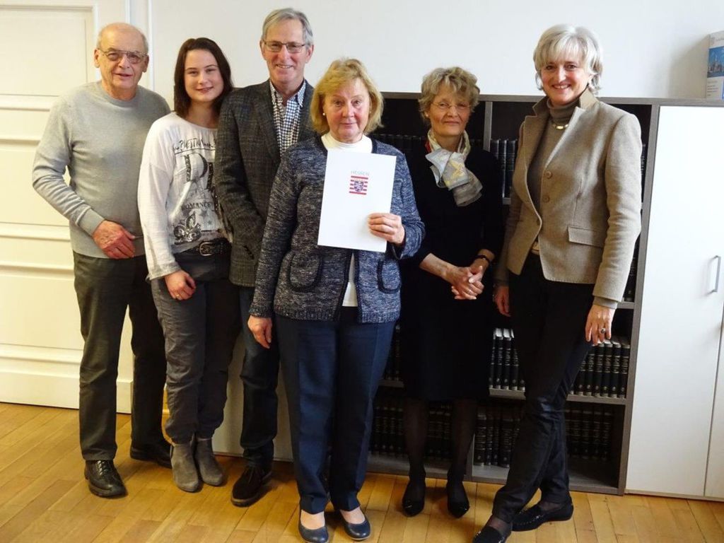 Foto (von links): Hans-Jürgen Müller, Vorsitzender der Bezirksvereinigung Hanau, Alexandra Schweinoch, zuständige Ansprechpartnerin bei der Stadt Maintal bei Angelegenheiten vom Ortgericht und Schiedsamt, Armin Schmidt, Schiedsmann für Wachenbuchen, Barbara Vreden, ehemalige Schiedsfrau für Bischofsheim, Sigrid Bergmann, neue Schiedsfrau für Bischofsheim und Cornelia Pfeifer, Richterin am Amtsgericht Hanau als die ständige Vertreterin eines Direktors.