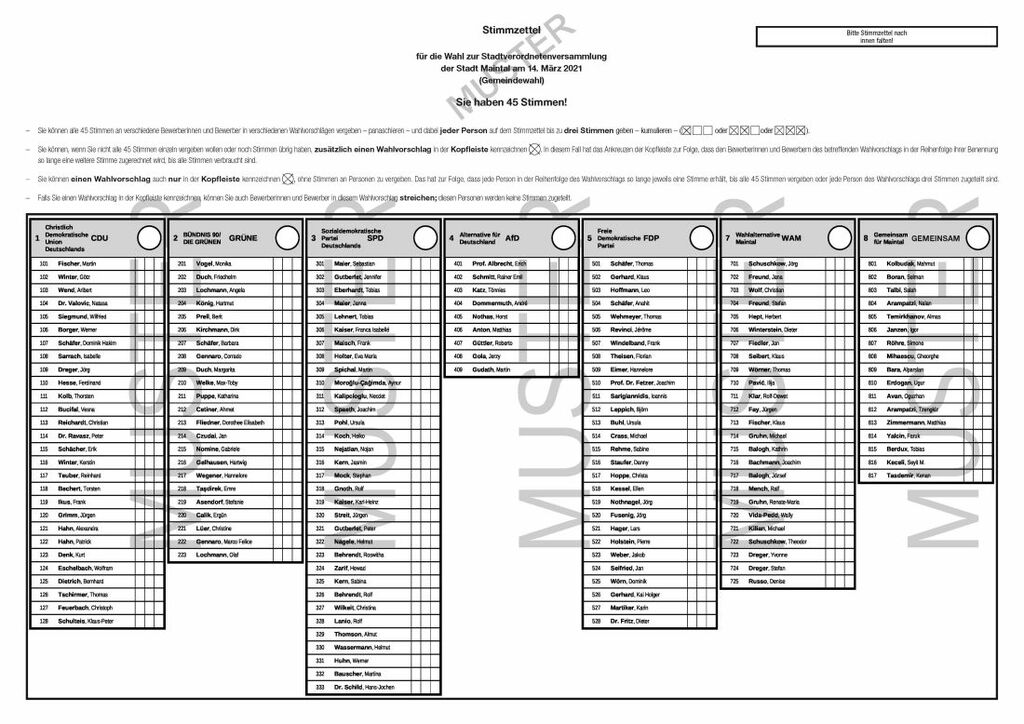 Bei der Wahl am 14. März können die Wähler*innen panaschieren und kumulieren. Das heißt, sie können ihre Stimmen einzeln an beliebige Bewerber*innen, auch aus verschiedenen Listen, vergeben (panaschieren) oder einzelnen Kandidat*innen bis zu drei Stimmen geben (kumulieren). Wer sich für diese Möglichkeiten neben der Option der Listenwahl entscheidet, möchte sich wahrscheinlich näher mit den Bewerber*innen befassen und sich im Vorfeld über die Verteilung der Stimmen Gedanken machen. Die Musterstimmzettel werden deshalb der Ausgabe des Maintaler Boten vom ersten Februar-Wochenende beigelegt sein. Sie sind außerdem bereits auf der Homepage der Stadt Maintal einzusehen. Dort finden sich weitere Informationen rund um die Kommunalwahl, die ebenfalls die Wahl des Ausländerbeirats umfasst.