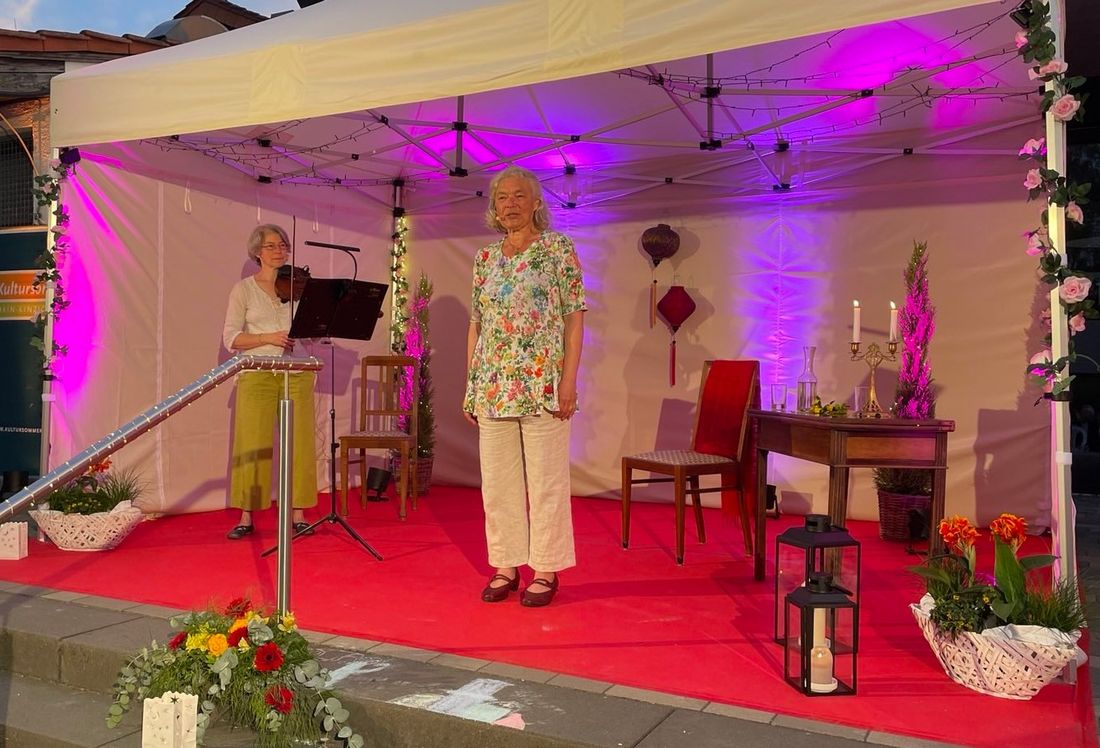 Am 08.06. konnten sich die gut vierzig Besucherinnen und Besucher der Sommernachtsgeschichten bei bestem Wetter OpenAir an der Nidderhalle in Eichen davon überzeugen, dass das Erzählen von Geschichten nicht nur eine traditionelle Kulturtechnik, sondern auch eine große Kunst ist.