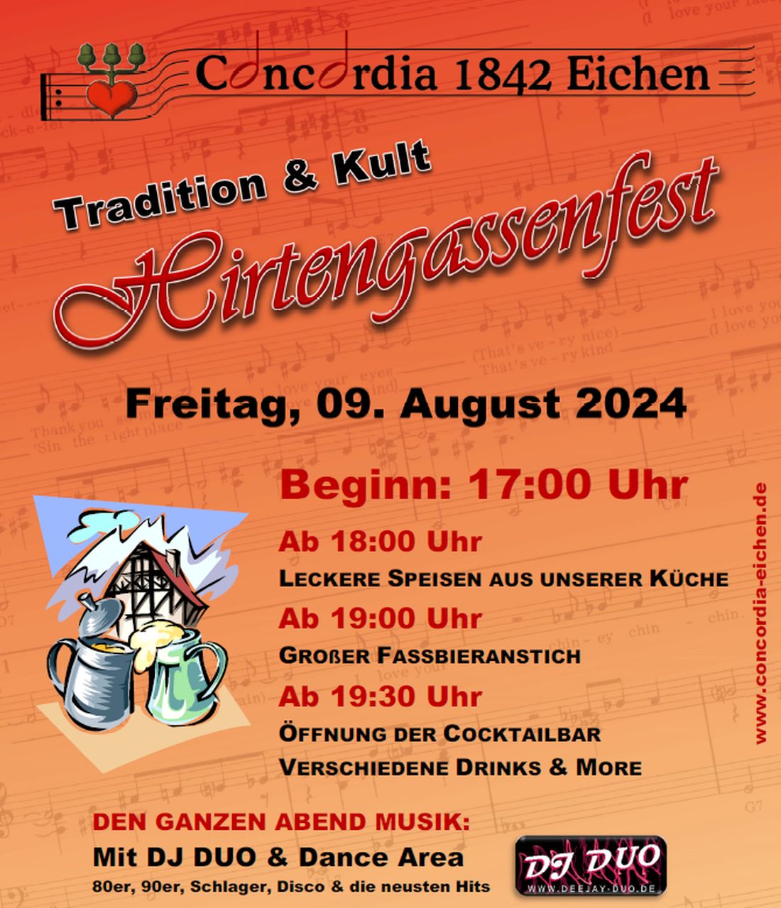 Am Freitag, den 9. August 2024, laden die Sängerinnen und Sänger der Concordia 1842 Eichen zum mittlerweile 29. Hirtengassenfest ein.
