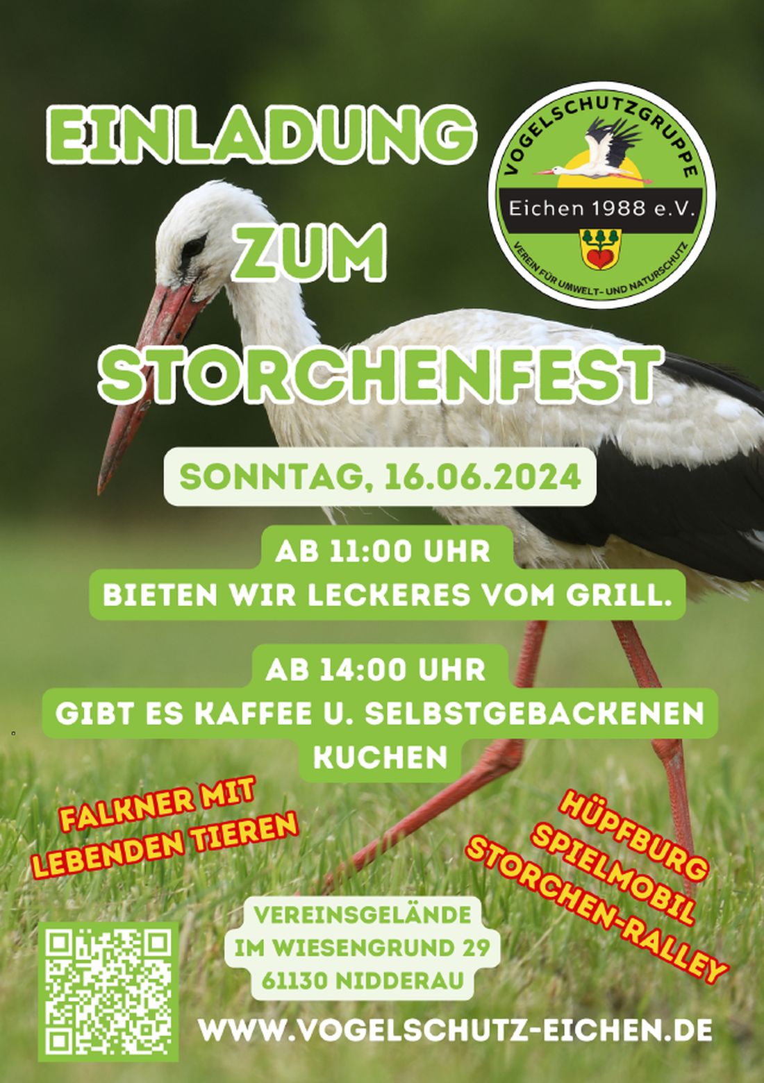 Die Vogelschutzgruppe Eichen 1988 e.V. lädt ein zum Storchenfest am 16.06.2024 ein.