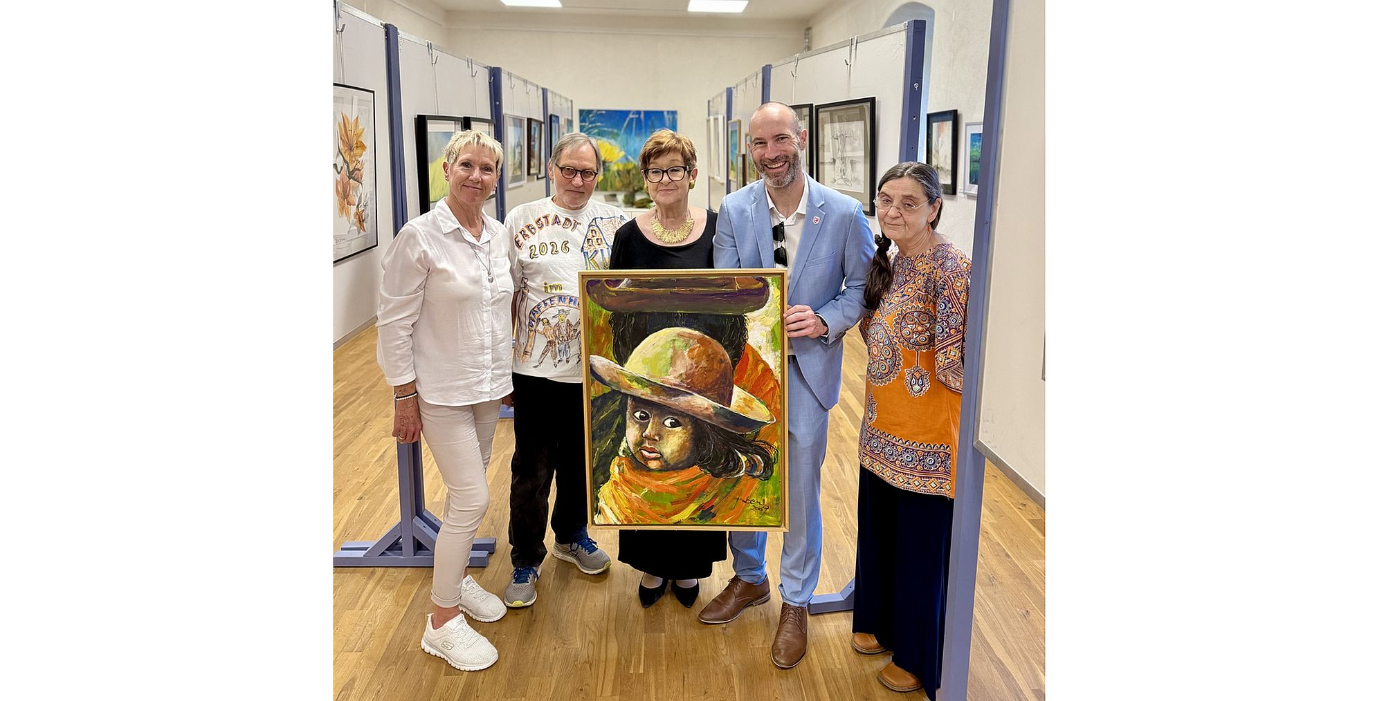 Kunst im Pfaffenhof (von links): Ellen Neubert, Engagement-Lotsin; Helmut Gockert, Geschichtsverein Erbstadt und Maler im Malkurs; Karin Erben, Kursleiterin Malkurse für Seniorinnen und Senioren; Andreas Bär, Bürgermeister; Ute Bächer, Malerin im Malkurs.
