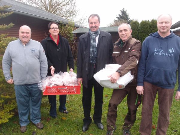 Der Verein spendete 17 Kaninchen, die von der Stadt Nidderau an sozialbedürftige Familien weitergereicht werden, um ihnen etwas Gutes für die Weihnachtstafel zu bescheren. „Wir wollen als Verein auch etwas für Menschen tun, denen es nicht so gut geht“, sagte Vorsitzender Gerd Kurz (links), der gemeinsam mit Walter Rode (rechts) den Festtagsschmaus an Bürgermeister Gerhard Schultheiß, Erste Stadträtin Monika Sperzel und Mitarbeiter Willi Müller überreichte. „Was der Kaninchenzuchtverein H445 Ostheim Jahr für Jahr tut, ist ein nachahmenswertes Vorbild für andere, sich über die Vereinsgrenzen hinaus zu engagieren“, lobten Schultheiß und Sperzel die Aktion.