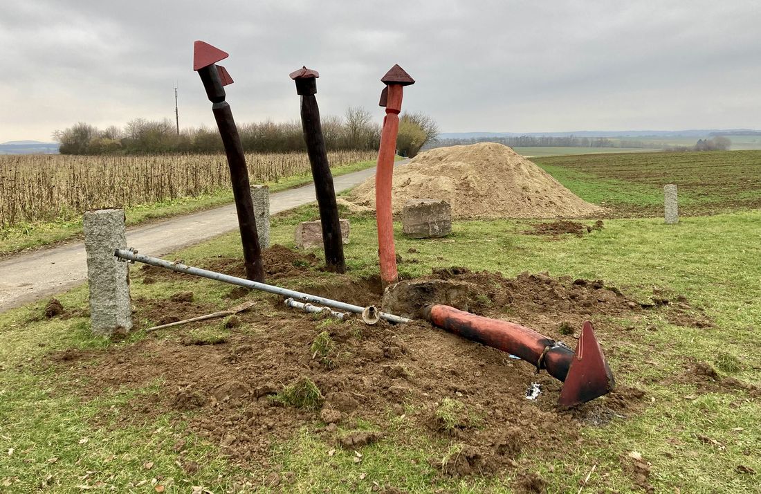 Es ist ein Vandalismus, der einem das Herz zerreißt: Nachdem es bereits in der Nacht von Sonntag auf Montag zu Brandstiftung an der Stelenpyramide am Wartbaum bei Windecken kam, wurden in der Nacht zum Donnerstag zahlreiche Stelen herausgerissen und teilweise angezündet. Dabei kam nach erster Einschätzung sogar ein Fahrzeug zum Einsatz, das die zuvor mit einem Seil verbundenen Stelen herausriss. Zuvor wurden die Fundamente der Stelen mit Werkzeugen freigelegt.