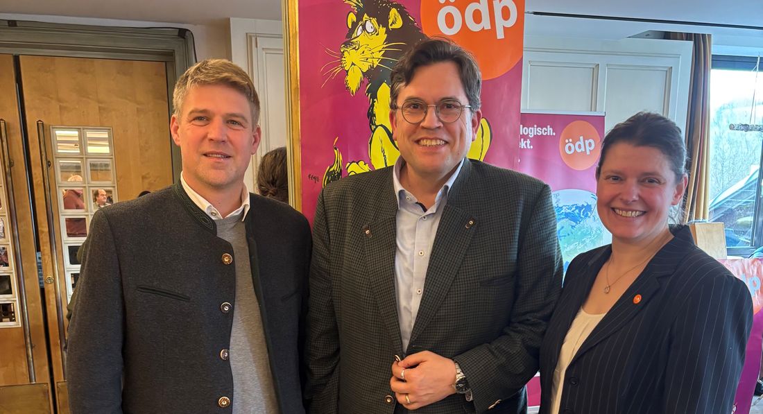 Windecker ÖDP-Kandidat Dr. Ralf Grünke (Mitte) mit den beiden ÖDP-Landesvorsitzenden Tobais Ruff (links) und Agnes Becker (rechts).