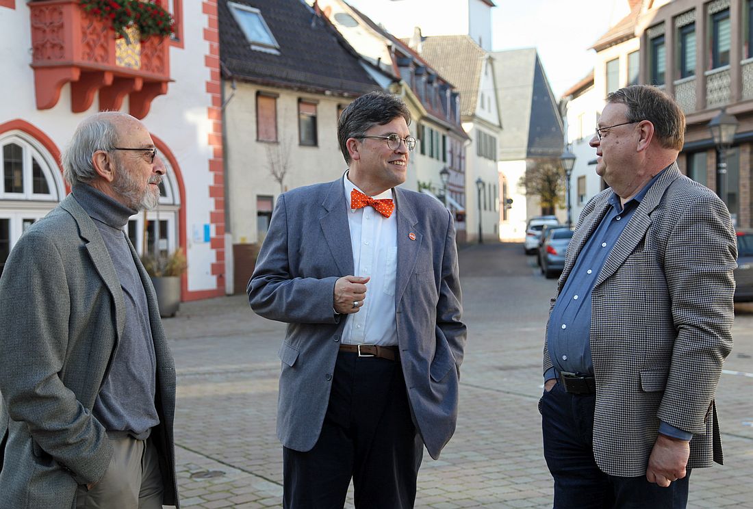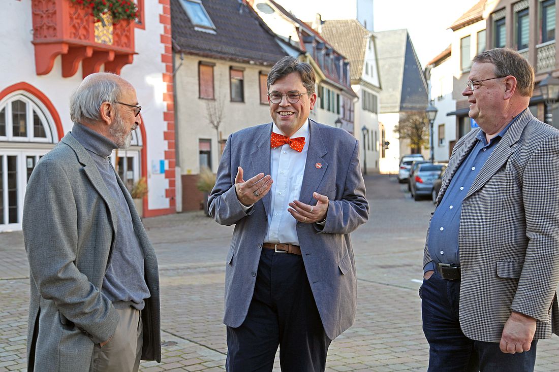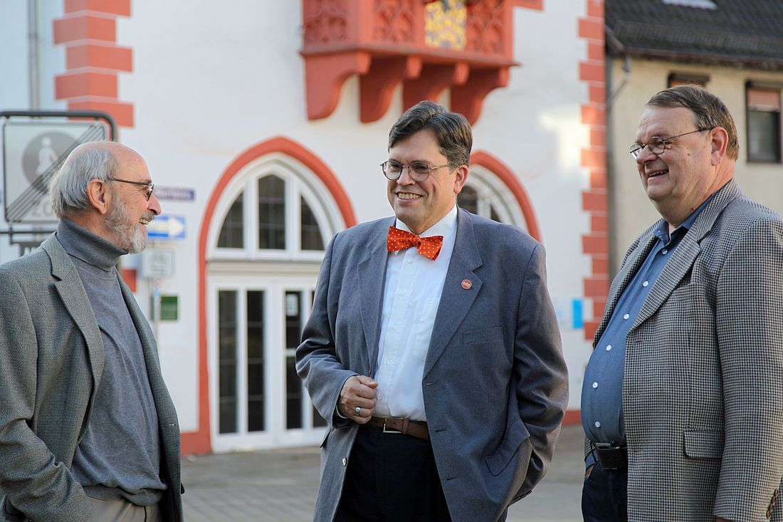 Kandidaten der ÖDP für den Ortsbeirat Windecken im Gespräch auf dem Windecker Marktplatz. Von links nach rechts: Walter Haberl (Listenplatz 3), Dr. Ralf Grünke (Listenplatz 1), Christian Maiwald (Listenplatz 2).