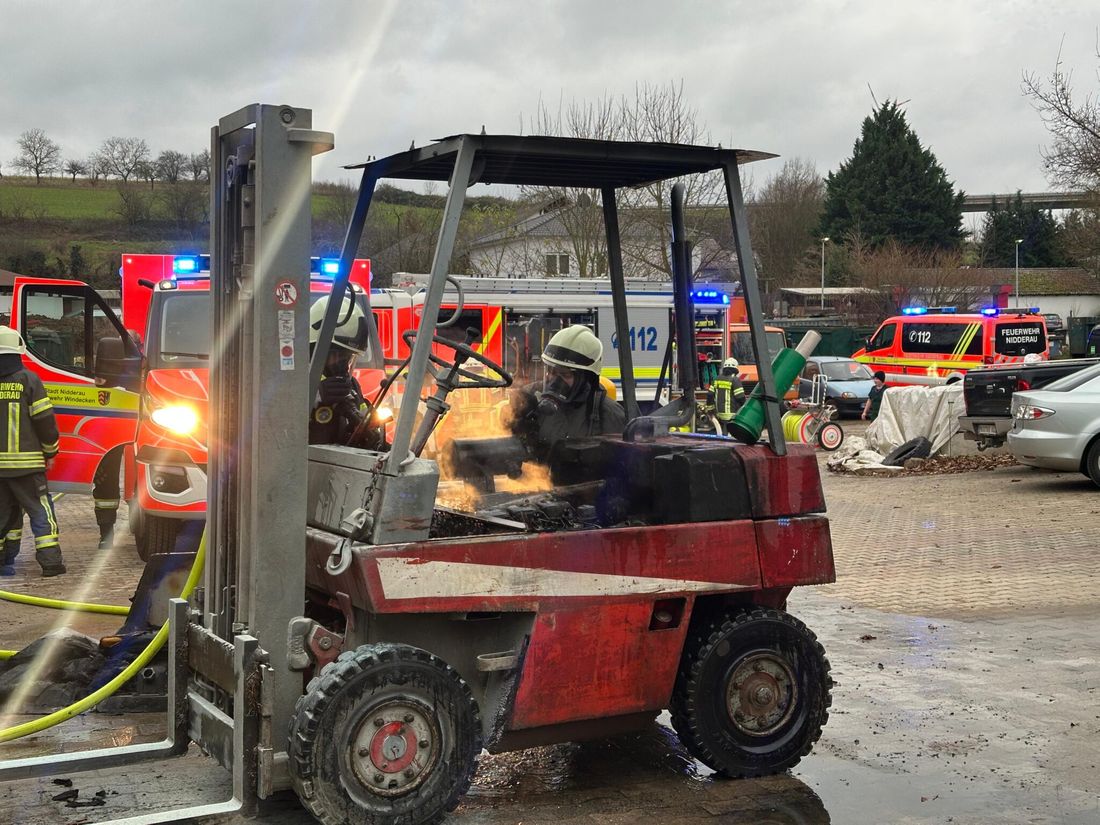 Die Feuerwehr Nidderau wurde am Montag um 15.01 Uhr mit dem Einsatzstichwort *Brennt Gabelstapler in Gebäude* in den Bücherweg in Windecken alarmiert. Bei Eintreffen der Feuerwehr befand sich der betroffene Gabelstapler bereits im Außenbereich. Durch anwesende Mitarbeiter wurden erfolgreich eigene Löschversuche mit Feuerlöschern vorgenommen.