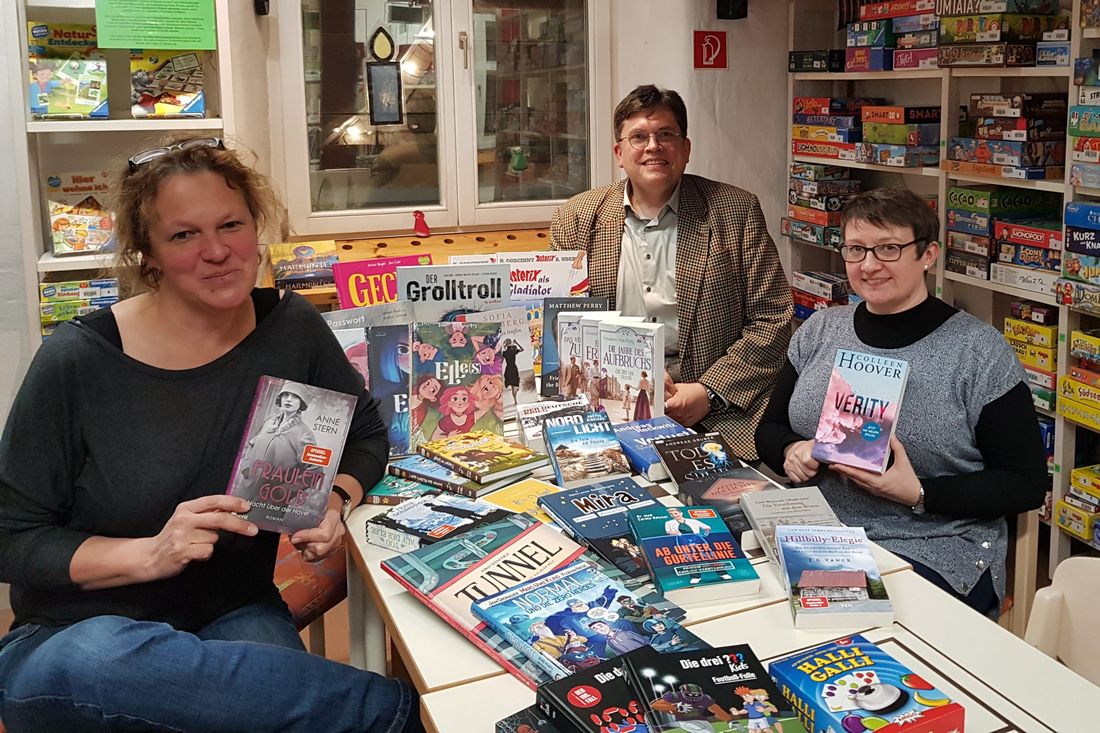 Frauke Blum und Dr. Ralf Grünke übergeben Medienwünsche an Jutta Kadau, Leiterin der Stadtbücherei Nidderau.