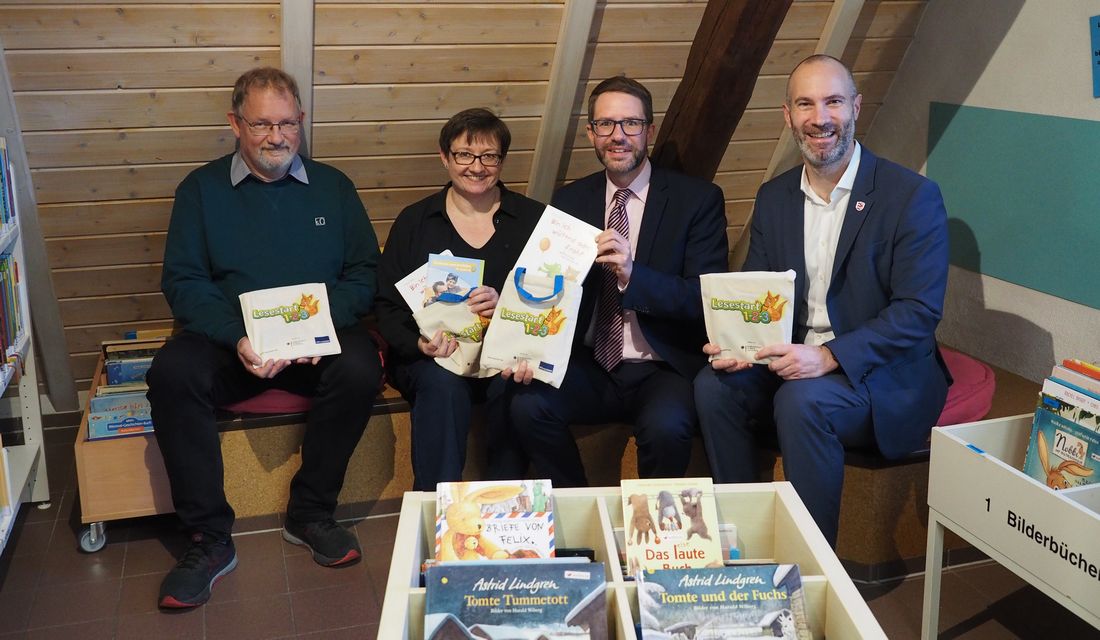 Landrat Thorsten Stolz (Zweiter von rechts), Nidderaus Bürgermeister Andreas Bär (rechts), Jutta Kadau, Leiterin der Stadtbücherei, und Alexander Budjan werben gemeinsam für das Projekt Lesestart.