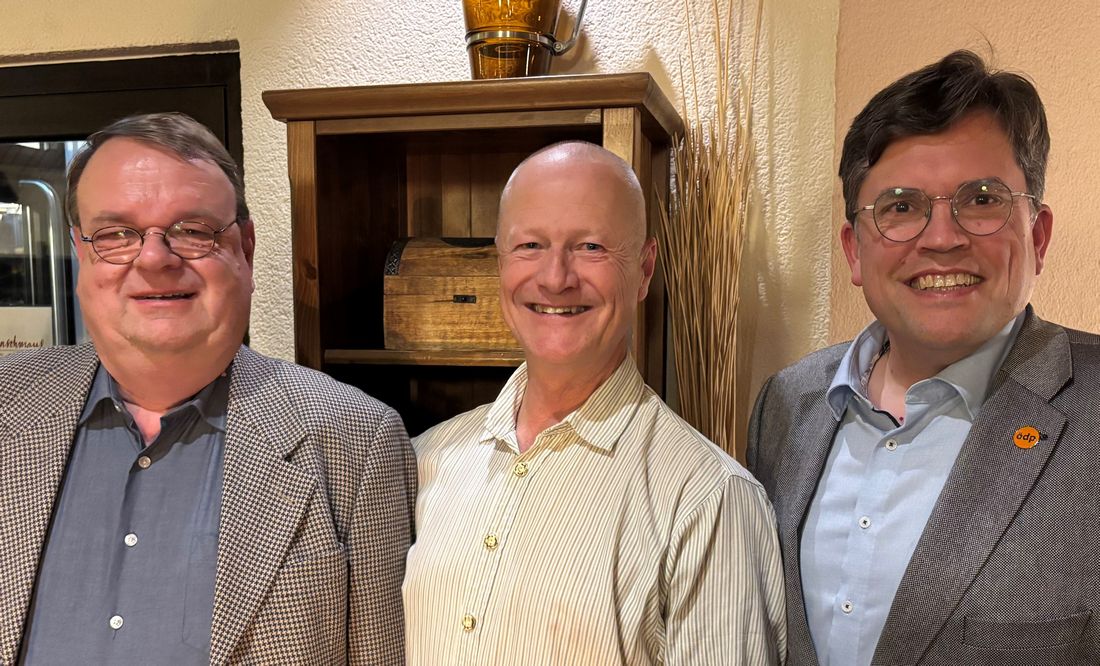 Der hessische ÖDP-Landesvorsitzende Markus Hutter (Mitte) nach der Aufstellungsversammlung in Windecken mit den beiden Kandidaten Christian Maiwald (links) und Dr. Ralf Grünke (rechts). Walter Haberl wurde in Abwesenheit gewählt.