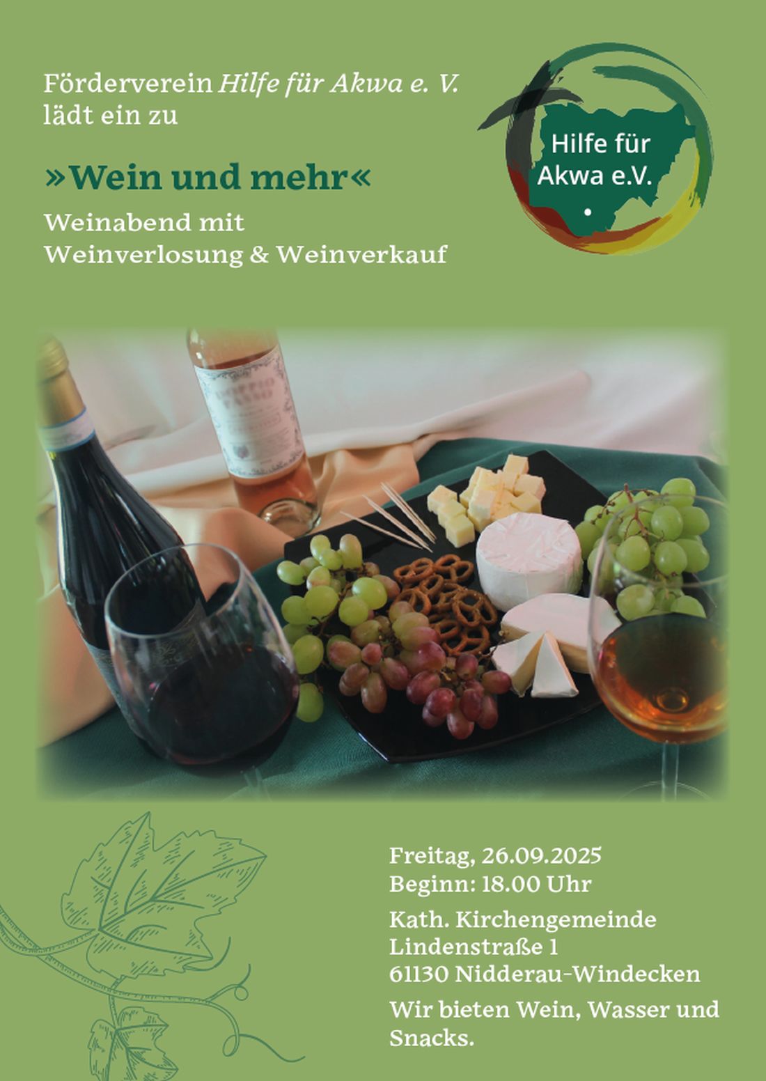 Der Förderverein Hilfe für Akwa e. V. lädt herzlich zu einem genussvollen und geselligen Abend unter dem Motto „Wein und mehr“ ein.