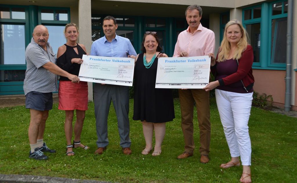 Foto: Der Erlös des Sponsorenlauf des Vereins socail-bag.com wird übergeben (von links): Fotograf Manfrey Ay, Birgit Fandrey, Hammersbachs Bürgermeister Michael Göllner, Güner Dogramaci, Nidderaus Rathauschef Gerhard Schultheiß und Anke Gaußmann.