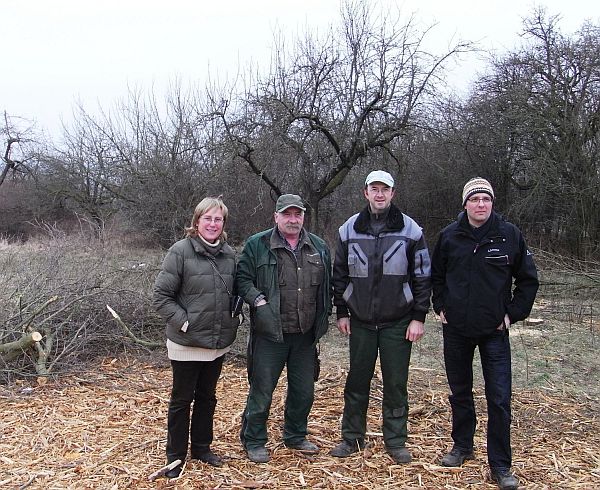 Foto: Entbuschung am Ohlenberg in Windecken im Februar 2013. Von links: Barbara Fiselius Landschaftspflegeverband MKK, Klaus Keuchler, Garten- und Landschaftsbau, Schäfer Kai Wendt, Stephan Zöller, Umweltamt der Stadt Nidderau.