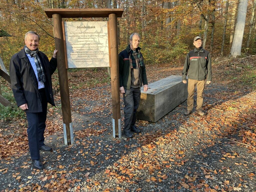 Foto: Nidderaus Bürgermeister Gerhard Schultheiß, Forstamtsleiter Lutz Hofheinz und Revierförster Udo Kaufmann (von links) an der neuen Stundenbank im Wald bei Eichen.