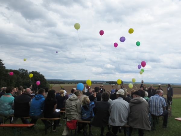 Dieses Tauffest war ein weiterer Höhepunkt innerhalb des Rahmenprogramms von KunstMais 2014 und fand unter Federführung der Kircheneintrittsstelle des Kirchenkreises Hanau von Pfarrer Dr. Steffen Merle statt. Auf der Wiese mit Fernblick am Buchwald, vor dem Maislabyrinth, verbreiteten bunte Luftballons freudige Stimmung. Pfarrer Otto Löber, der für seine kreativ gestalteten Gottesdienste bekannt ist, stellte sich flexibel auf die Tauffamilien ein und änderte spontan die Reihenfolge der Taufen. Ebenso flexibel unterstützte das „Freie Hof Buchwald Blasorchester“ ( FHBuBlaO) unter der Leitung von Dr. Lothar Schmidt den Gottesdienst musikalisch. Das Taufversprechen wurde symbolisch mit den Luftballons in den Himmel geschickt. Geschwister und anwesende Kinder bedachte Pfarrer Löber mit kleinen Buchgeschenken. Sogar der Regen der letzten Tage hatte eine Pause eingelegt. So war es ein rundum gelungenes Fest, das bei Kaffee und Kuchen im Schutz der benachbarten Gerätehalle ausklang.