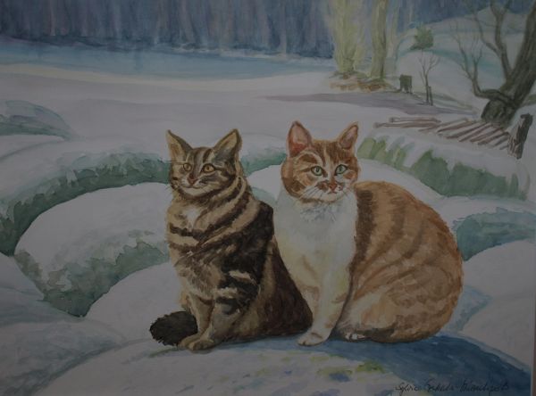 So etwa das Gemälde "Wintertag in Wilhelmsbad", das fröhliche Kinder beim Schlittenfahren zeigt, oder "Mikesch und Biene staunen in den Schnee": Da sitzen zwei Katzen nebeneinander auf Strohballen und starren mit großen Augen in die weiß verzuckerte Landschaft ringsum. "Alle Arbeiten sind gegenständlich gehalten, um den Betrachter sofort in das Geschehen mit einzubehiehen", erklärt die Künstlerin. Sylvia Czeskleba-Stürzenberger war in den 70er und 80er Jahren Karikaturistin für verschiedene Frankfurter Tageszeitungen. "Zum Aquarell kam ich durch meine Fotografien", sagt sie. Seit 1995 stellt sie ihre Arbeiten hauptsächlich im Main-Kinzig-Kreis, aber auch in Frankfurt und Ungarn aus. Wer möchte, kann die Künstlerin telefonisch unter 06181-495207 erreichen und mit ihr persönlich ein Treffen in der Ausstellung vereinbaren.