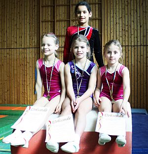 Larissa Kortmann startete in der Wettkampfklasse P4. Wie gewohnt absolvierte sie ihre Übungen gekonnt und mit guter Spannung an allen Geräten. Die höchste Punktzahl erreichte sie am Reck, aber auch die Bodenübung konnte sie graziös und mit großer Bewegungsweite vortragen. Als Siegerin nahm sie stolz die Goldmedaille entgegen. Julia Kempf turnte im gleichen Wettkampf wie Larissa. Obwohl sie zwei Jahre jünger ist als ihre Konkurrentinnen, überraschte sie mit sicheren und selbstbewusst vorgetragenen Übungen. Unbeeindruckt vom Wettkampfgetümmel oder dem zu hohen Schwebebalken, absolvierte sie ihren ersten Wettkampf und strahlte auf dem Siegerpodest noch mehr als ihre Silbermedaille.