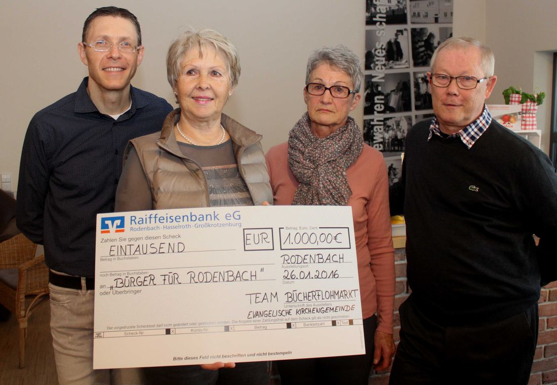 Foto: Spendenübergabe durch Ilse-Marie Wiegelmann (2.v.r.) vom Team „Bücherflohmarkt“ an die Sprecherin „Bürger für Rodenbach“ Mechthilde Lukas (2.v.l.) im Beisein Volker Netz, dem 2. Vorsitzenden (rechts) und Michael Steppuhn Vorstandsmitglied vom Trägerverein Oberrodenbach.