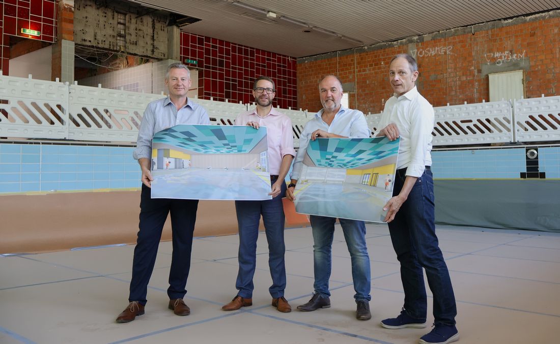 Von links: Erster Kreisbeigeordneter Andreas Hofmann, Landrat Thorsten Stolz, Betriebsleiter Reinhold Walz und Architekt Gösta Weber zeigen die Pläne, wie das Hallenbad künftig aussehen wird.