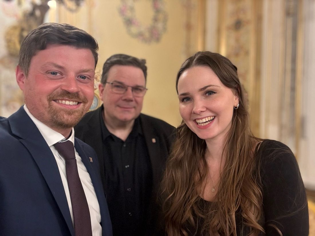 Landtagsabgeordneter Appel (links) würdigt beim „Abend der Kultur“ im Landtag künstlerisches & ehrenamtliches Engagement von Annika Hofmann & Reiner Erdt und gibt persönliche Führung durch den Landtag.
