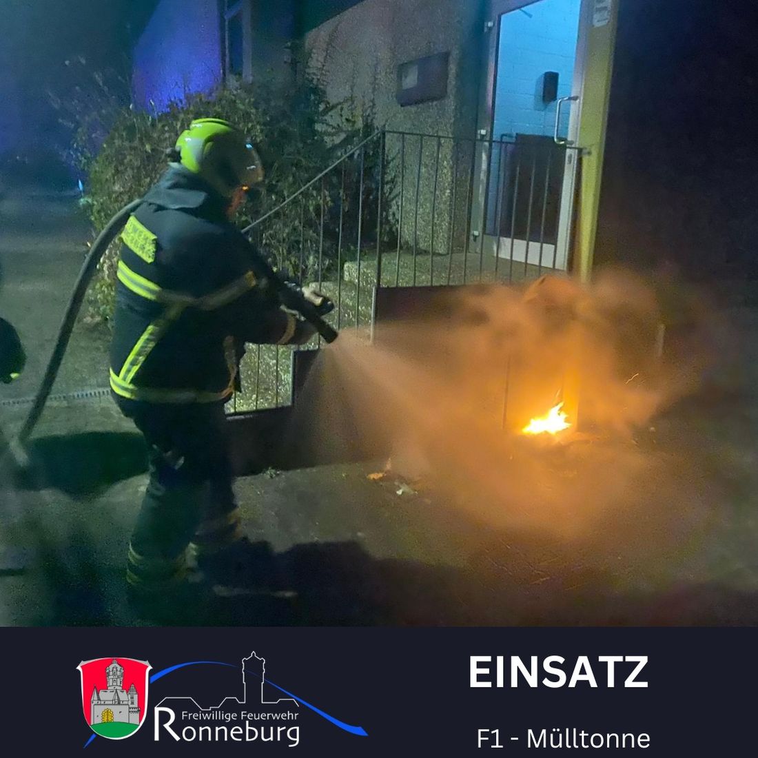 Den ersten Einsatz im neuen Jahr bescherte der Freiwilligen Feuerwehr Ronneburg ein Mülltonnenbrand an der Mehrzweckhalle. "Alarmiert wurden wir hierzu um 01:22 Uhr. Mittels Schnellangriff war das Feuer schnell gelöscht, sodass die neun ausgerückten Einsatzkräfte kurze Zeit später ins Feuerwehrhaus zurückfahren und die Fahrzeuge wieder einsatzbereit machen konnten", so die Feuerwehr in ihrem Bericht.