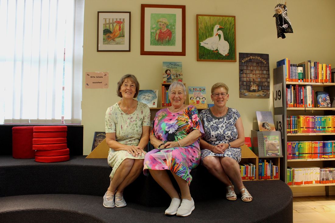Künstlerin Edelgard Dorr (Mitte) zusammen mit Uschi Dresen (links) und Büchereileiterin Martina Hack in der Kinderabteilung, wo die Arbeiten von Edelgard Dorr stets ein besonderer Hingucker waren. Edelgard Dorr dankt dem kompletten Team der Bücherei, zu dem auch Corinna Protzmann gehört.
