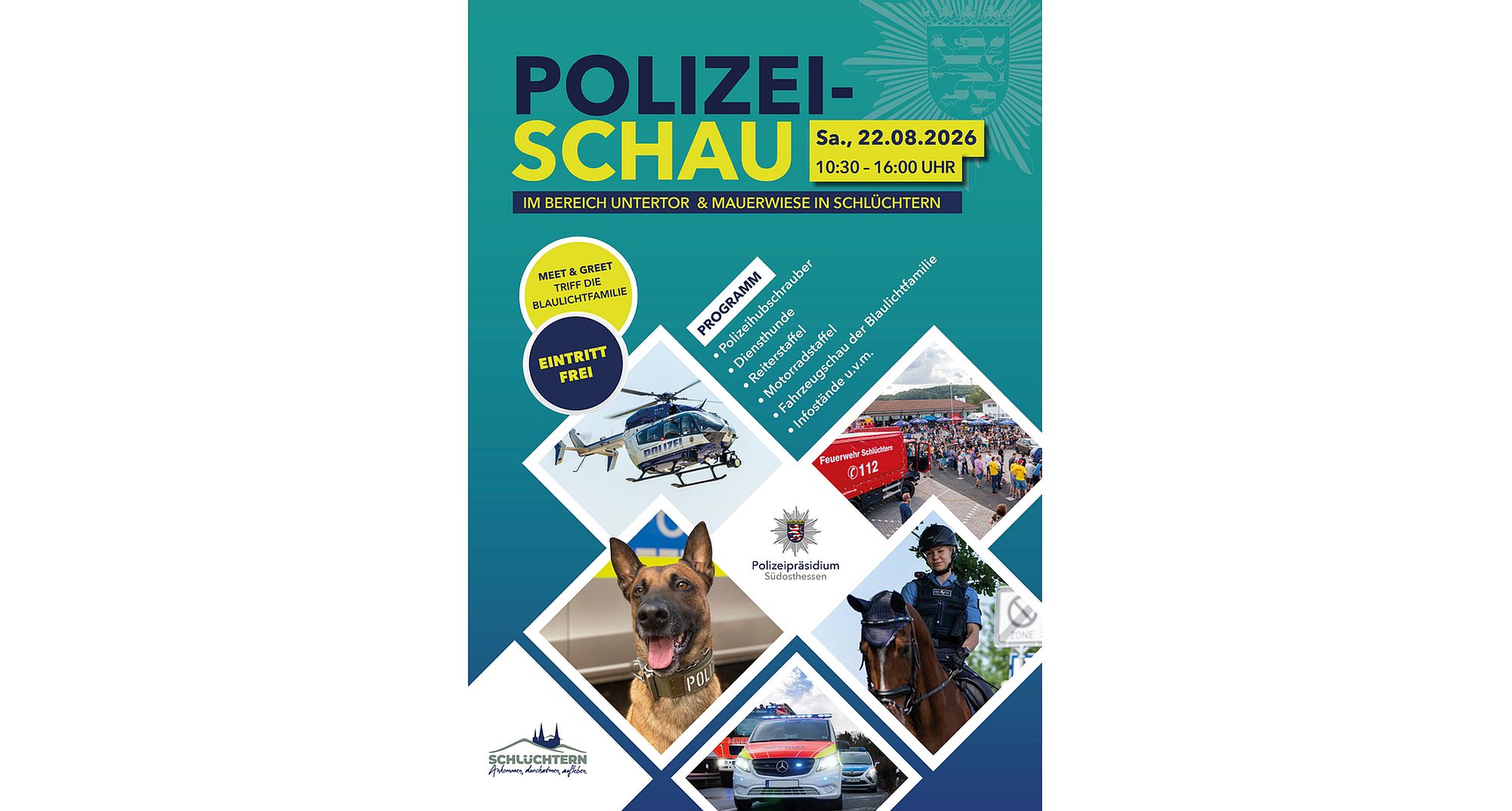 Zur 36. Polizeischau am 22. August 2026 lädt das Polizeipräsidium gemeinsam mit der Stadt Schlüchtern unter dem Motto "Respekt zeigen - Respekt erfahren: Begegnungen mit der Blaulichtfamilie" alle Bürgerinnen und Bürger ein. Die Veranstaltung findet von 10.30 Uhr bis 16 Uhr statt. Die verschiedenen Veranstaltungsflächen werden ausgewiesen und befinden sich im Bereich "Untertor-Parkplatz" beziehungsweise auf dem Gelände der Freiwilligen Feuerwehr Schlüchtern, "Mauerwiese", Sportgelände "Auwiese" (Hanauer Straße) sowie entlang der Straße "Unter den Linden" in Richtung Stadthalle.