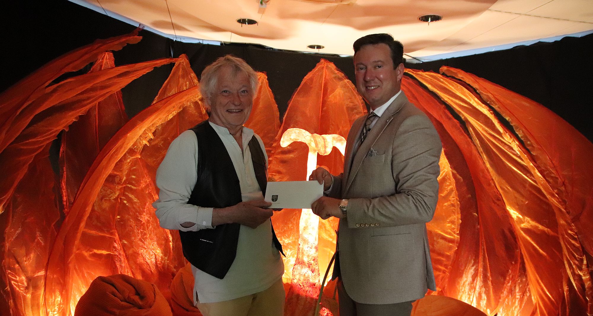 Sie „blühten“ gemeinsam auf: Bürgermeister Matthias Möller (rechts) dankte Gerwin von Monkiewitsch für sein Engagement in Sachen Kultur. Foto: Ulrich Schwind