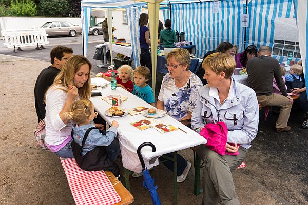 Foto: „Trotz kleinerer Regenschauer ließen sich die Besucher des Sommerfestes die große Auswahl selbstgebackener Kuchen schmecken.“