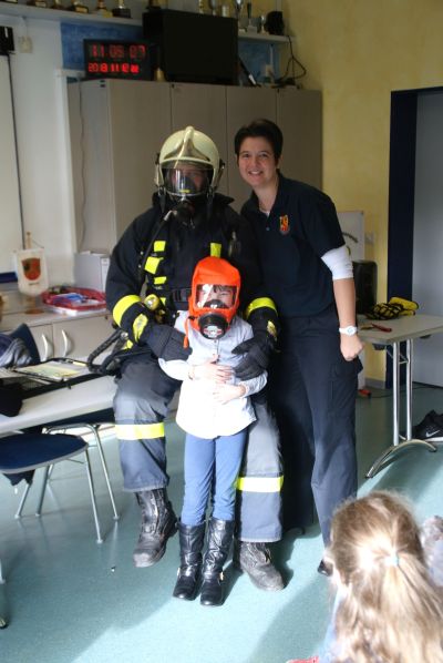 Der zum Model umfunktionierte Angehörige der Einsatzabteilung, Christian, demonstrierte eindrucksvoll, welche Kleidungs- und Ausrüstungsgegenstände ein Feuerwehrmann so tragen muss. Die Kinder staunten nicht schlecht, als sie hörten, dass man auch bei 30?C mit dickem, schwarzen Mantel und Handschuhen ein Feuer bekämpft, Melli muss dann sogar ihre schicken, schwarzen Schuhe gegen derbe Stiefel eintauschen. Einen kleinen Eindruck davon, wie warm es unter Schutzkleidung sein kann bekamen die Kinder vermittelt: sie durften eine Fluchthaube aufsetzen: eine Atemschutzmaske mit einem Kopfteil, die Leute überstreifen wenn sie aus Rauch und Feuer gerettet werden