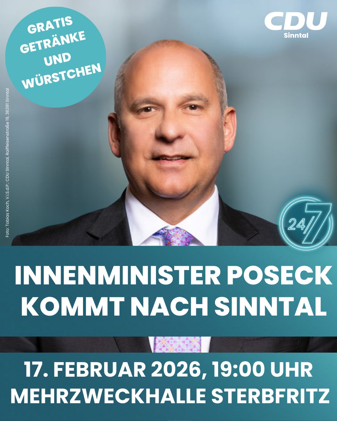 Am Dienstag, 17. Februar 2026, kommt der Hessische Minister des Innern, Prof. Dr. Roman Poseck, auf Einladung der CDU-Fraktion Sinntal um 19:00 Uhr in die Mehrzweckhalle Sterbfritz.
