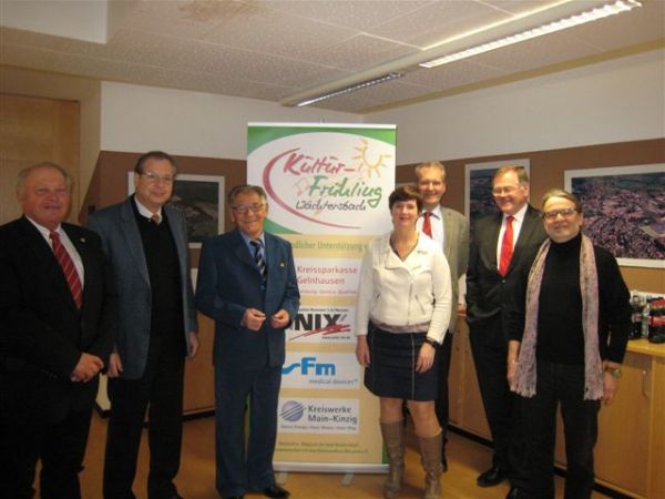 Foto: Bürgermeister Krätschmer und Erster Stadtrat Weiher stellen gemeinsam mit den Sponsoren und dem Kleinkunstkreis Märzwind das Programm des diesjährigen Kulturfrühlings vor. Die Teilnehmer von links nach rechts: Werner Nix (Autohaus Nix), Dr. Dziengel (sfm medical services), Bürgermeister Rainer Krätschmer, Miriam Franz (Unternehmensmarketing Kreiswerke Main Kinzig GmbH), Erster Stadtrat Andreas Weiher, Vorstandsvorsitzender Gerhard Kleespies (Kreissparkasse Gelnhausen) sowie Gerd Schneider (Kleinkunstkreis Märzwind).