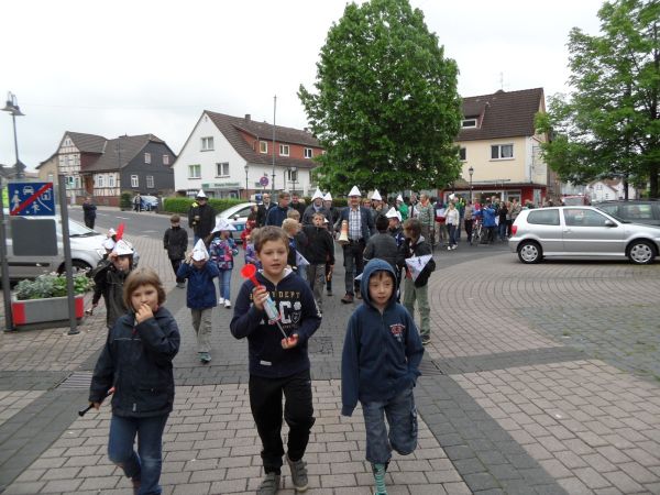 Zuvor hatten sich um 9.00 Uhr zahlreiche Kinder, Jugendliche und Erwachsene auf dem Platz am Feuerwehrhaus eingefunden. Ausgerüstet mit selbstgebastelten Wächterhüten und vielen verschiedenen Gegenständen, die zum „krachmachen“ hervorragend geeignet sind, wie Trillerpfeifen, Rasseln, Trommeln, ging es dann laut lärmend durch die Gassen bis hinauf auf den Marktplatz. Unterwegs wurde immer wieder angehalten um den Schlachtruf hören zu lassen; Erster Stadtrat Andreas Weiher forderte die Kinder auf: „Wächtersbach“ – und von diesen kam lautstark zurück „wake up“.