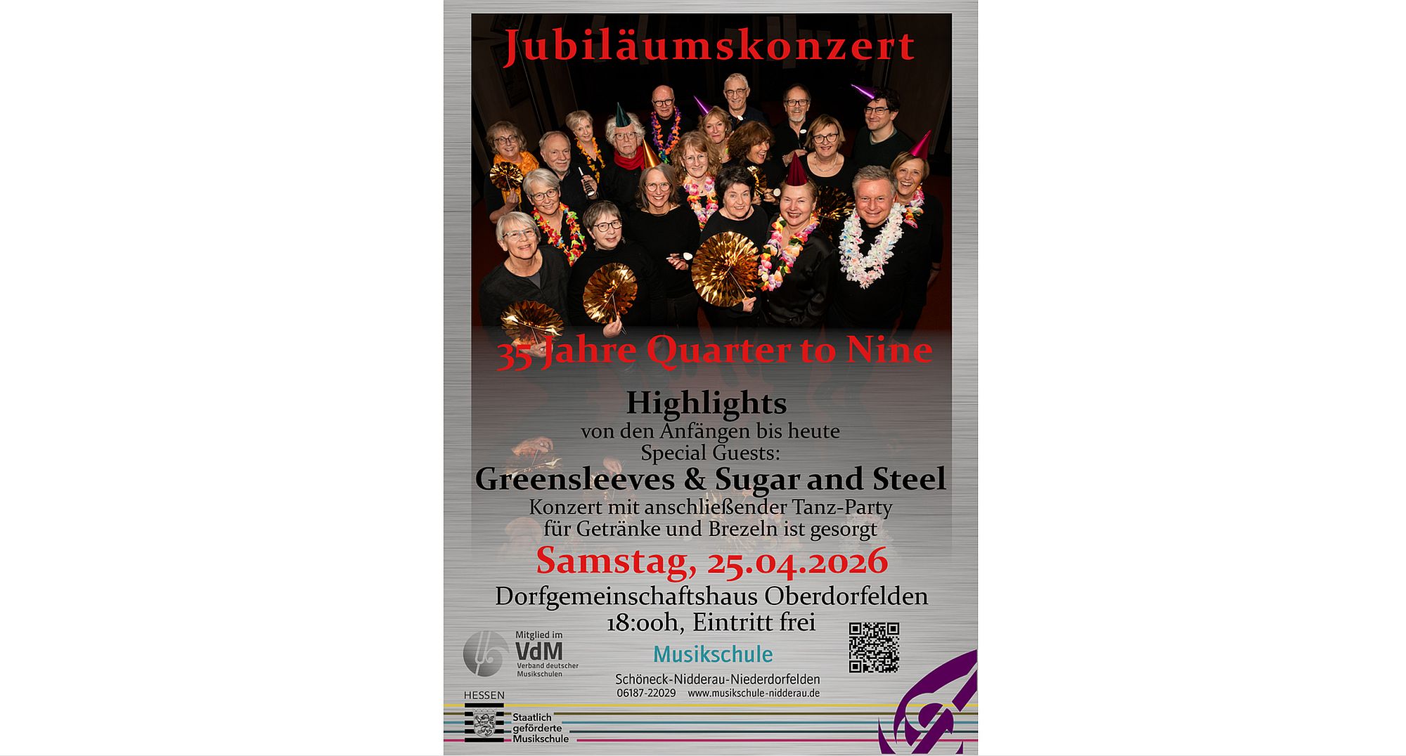 Der Popchor „Quarter To Nine“ der Musikschule Schöneck–Nidderau–Niederdorfelden feiert sein 35-jähriges Bestehen und lädt bei freiem Eintritt am Samstag, 25. April 2026, 18.00 Uhr zu einem besonderen Jubiläumskonzert in das Dorfgemeinschaftshaus Oberdorfelden, Weidenweg 3, 61137 Schöneck ein.