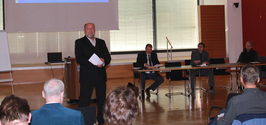 Foto: Kreisbeigeordneter Matthias Zach begrüßt die Besucherinnen und Besucher aus den Kommunen zur Veranstaltung rund um die Wasserrahmenrichtlinie.