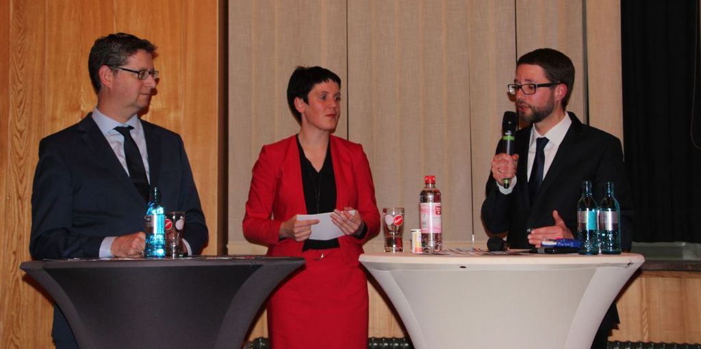 Für seinen 283. Termin hatte sich der Bürgermeister von Gelnhausen noch einmal prominenten Besuch in seine Heimatstadt eingeladen. Der hessische SPD-Chef und stellvertretende Bundesvorsitzende der Sozialdemokraten, Thorsten Schäfer-Gümbel, war am Donnerstagabend für den Wahlkampf-Endspurt und eine Frage-Antwort-Runde in den Kollegraum der Stadthalle Gelnhausen gekommen. Der war schnell gefüllt, auch aus umliegenden SPD-Ortsvereinen waren viele Vertreter gekommen, um Stolz ihre Unterstützung zu signalisieren. Moderiert wurde der Abend von der Gelnhäuser SPD-Vorsitzenden Kerstin Schüler, die bekanntlich bei einem erfolgreichen Ausgang der Landratswahl neue Bürgermeisterin der Barbarossastadt werden will.