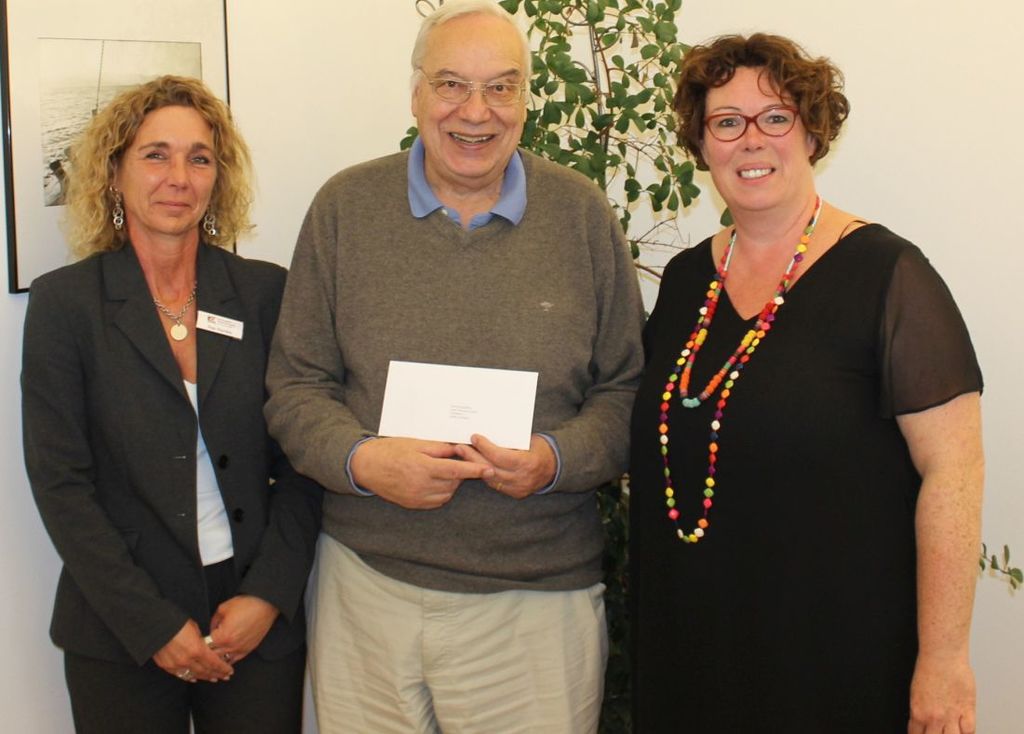 Foto: Scheckübergabe an Michael Schell von der Genossenschaft „Wohnbau60plus“, v.l.: Iris Hurrlein vom Kommunalen Center für Arbeit- Jobcenter und Soziales, Michael Schell und Erste Kreisbeigeordnete Susanne Simmler.