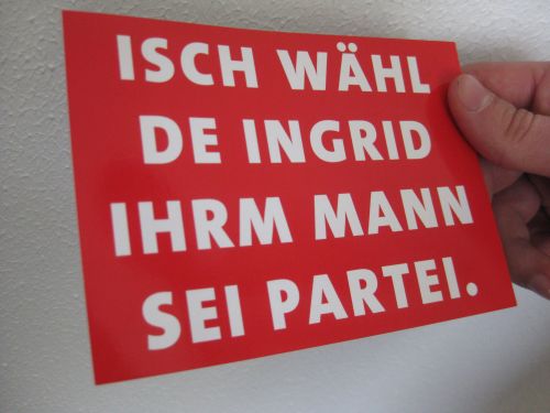 Anlässlich des 150-jährigen Jubiläums gibt’s eine Neuauflage des Aufklebers „Isch wähl de Ingrid ihrm Mann sei Partei.“