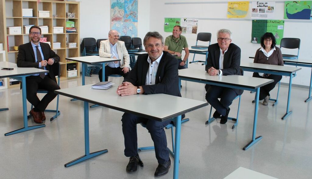 Foto: Drücken gut gelaunt die Schulbank in der Heinrich-Böll-Schule in Bruchköbel (von links): Landrat Thorsten Stolz, Martin Bornhardt (Stufenleiter), Martin Schneider (Stufenleiter), Günter Rau (Staatliches Schulamt Hanau), Schulleiter Ernst Münz und stellvertretende Schulleiterin Renate Weimert. Dort informierte sich der Landrat über die ersten Tage nach der Schulöffnung und begutachtete die räumlichen Abstandsregelungen.