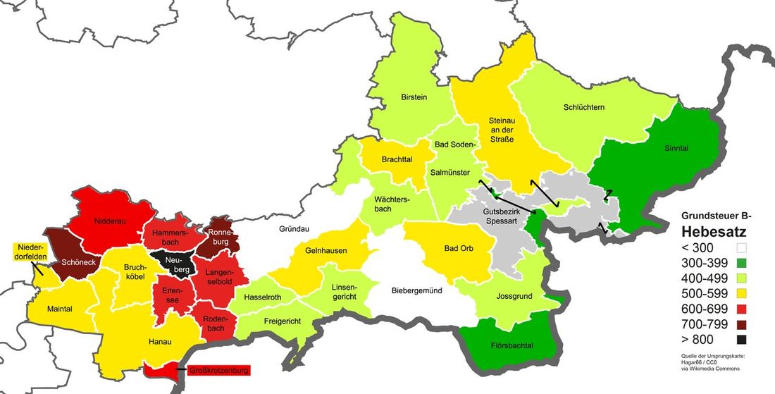 Die Grundsteuer B, die auf bebaute oder bebaubare Grundstücke erhoben wird und über die Nebenkosten auch Mieterinnen und Mieter trifft, haben zwölf Kommunen angehoben. Die deutlichste Steigerung gab es in Rodenbach (+235 Prozentpunkte). Mit nun 850 Prozent "eroberte” Neuberg die unrühmliche Spitze im Main-Kinzig-Kreis. Am wenigsten müssen die Steuerzahlerinnen und Steuerzahler mit weiterhin 200 Prozent in Gründau berappen. Der durchschnittliche Hebesatz der 29 Kreiskommunen stieg um 54 Punkte auf nun 545 Prozent. Dieser Wert liegt knapp über dem Durchschnitt aller hessischen Städte und Gemeinden, der 2024 543 Prozent beträgt.
