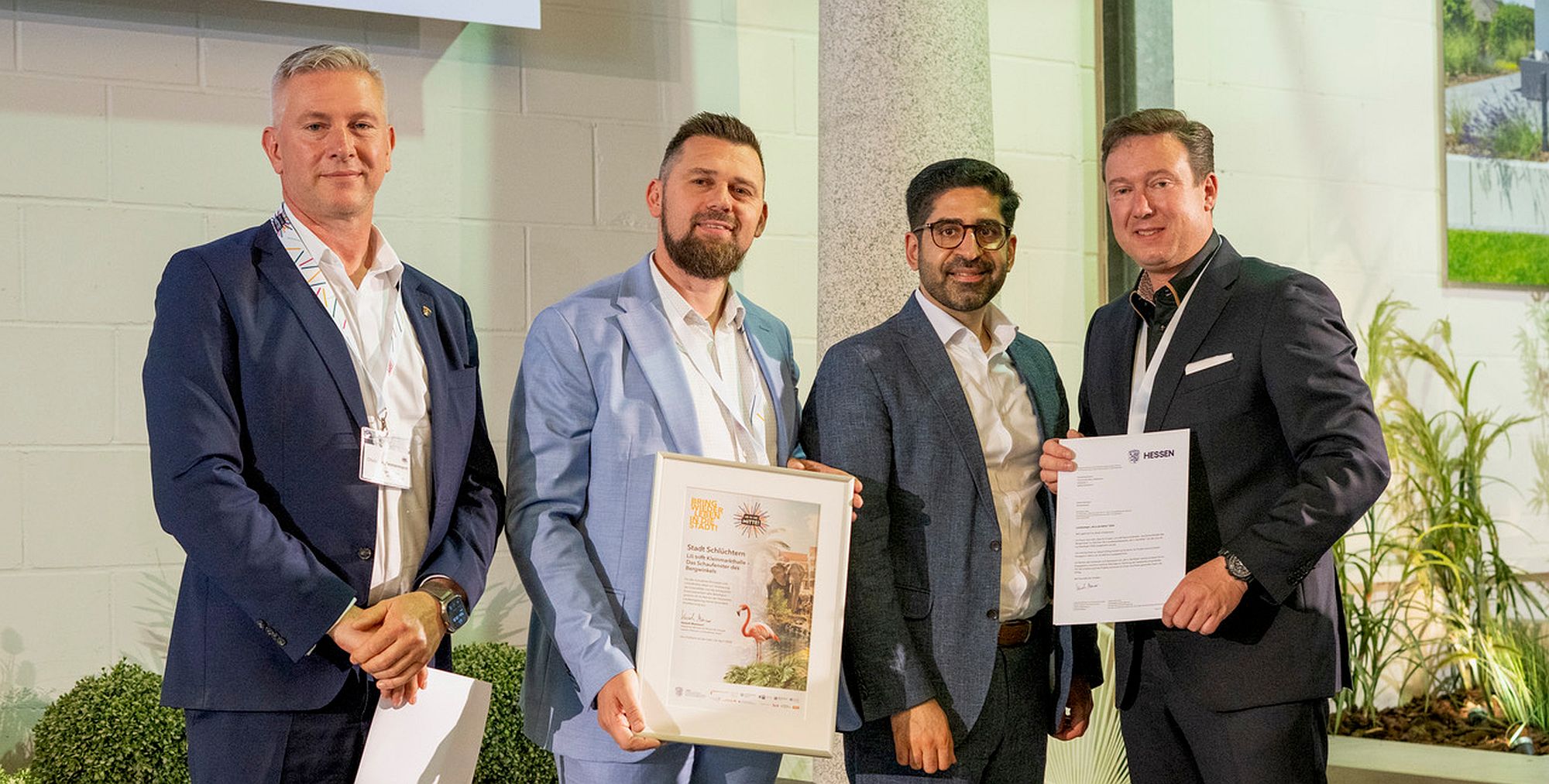 Der hessische Wirtschaftsminister und stellvertretende Ministerpräsident Kaweh Mansoori (Dritter von links) vergab das höchste Preisgeld beim Wettbewerb „Ab in die Mitte“ an (von links) Steinaus Bürgermeister Christian Zimmermann, Sinntals Rathauschef Thomas Henfling und Schlüchterns Bürgermeister Matthias Möller vom Tourismus-Verbund Bergwinkel. Foto: Bensing & Reith