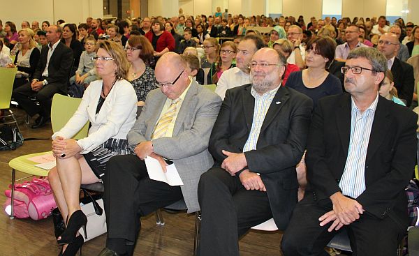 Foto: Ministerin Priska Hinz, Schulamtsdirektor Thomas Müller und Schuldezernent Matthias Zach (vorne von links) besuchten am Dienstag unter anderem die neuen Kreisrealschüler in Gelnhausen. Rechts: Uwe Häuser, Vorsitzender des Förderverein der Kreisrealschule Gelnhausen.