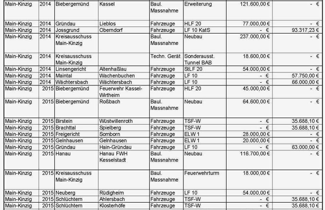 Im Einzelnen entfielen auf die besagten 14 Kommunen und den Main-Kinzig-Kreis unmittelbar die nachfolgend aufgeführten, projektbezogenen Zuwendungen, die für die Ausstattung der einzelnen Feuerwehren von besonderer Wichtigkeit und für die künftige Erfüllung der Aufgaben unerlässlich seien, stellten Klein und Reul abschließend fest.