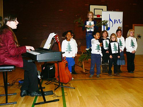 Weihnachtslieder zum Mitsingen gab es von Niklas Bauer und dessen Gitarren-Lehrer Peter Stöppler zu hören – eifrig von den Zuhörern mit gesummt oder auch mit gesungen. „Die Geschichte von den Tannenbäumchen“ wurde von des FES-Chorkindern in eine kleine, anschauliche Choreographie verpackt. Entweder als Tannenbaum oder auch als Waldvogel verkleidet erzählten sie mit Liedern rund um den Weihnachtsbaum, warum die Menschen sich gerne an zum Weihnachtsfest einen schönen Baum aussuchen und diesen liebevoll schmücken. Sehr anmutig dargebracht überzeugten die Chor-Kinder, unterstützt vom PHM-Kinderchor „Die vier Jahreszeiten“, auch mit einer homogenen stimmlichen Intonation, sicher begleitet am Klavier von ihrer Leiterin Bettina Weber, die sich diese Geschichte auch eigens für den FES-Auftritt ausgedacht hatte.