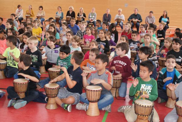 Thomas Soukou, der noch bis 2007 in seiner Heimat in Zentralafrika lehrte, gab den Rhythmus vor. Sofort war jedes Kind in seinen Bann gezogen. Er vermittelte den Schülern einen spielerischen Zugang zur eigenen Kreativität, in dem die Kinder in verschiedene Rollen wie Elefanten, Affen, Löwen und Giraffen schlüpften: Dabei war Mimik, Gesang und Bewegung in vollem Einsatz. Die Lieder machten Mut und vermittelten Freundschaftsgefühle, um kulturelle und soziale Grenzen zu überwinden. Zum Abschluss des Vormittages wurde dann nicht nur das Kollegium der Pestalozzischule zum Mitmachen eingeladen, auch die Eltern tanzten zum Gesang und den Trommelklängen ihrer Kinder. So hatte die ganze Schulgemeinde an diesem Vormittag viel Spaß.